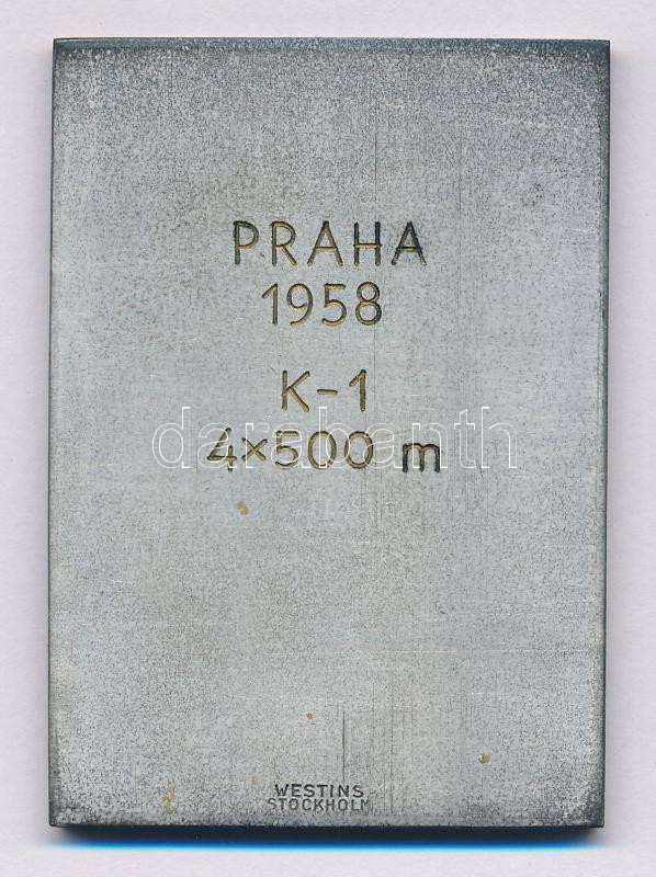 Csehszlovákia 1958. "ICFIC World Championships" egyoldalas ezüstözött fém kajak-kenu díjplakett, hátoldalán "PRAHA - 1958 - K-1 - 4x500 m" gravírozással, "Westins Stockholm" gyártói jelzéssel (41x60mm) műanyag tokban T:XF patina