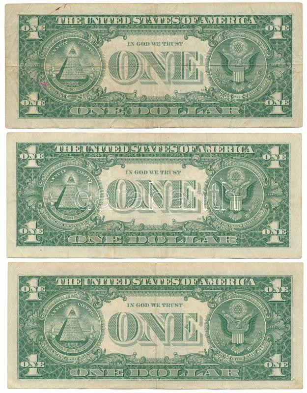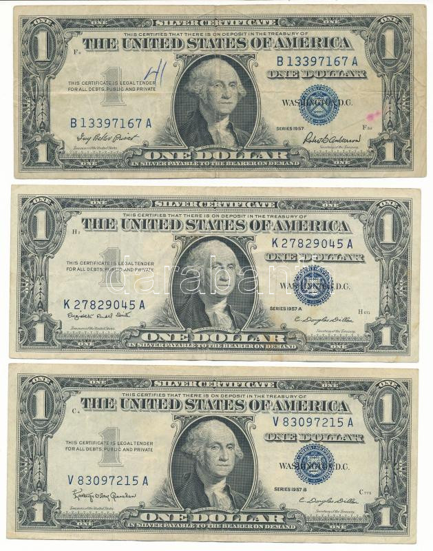 Amerikai Egyesült Államok 1957-1961. (1957) 1$ "Silver Certificate - kisméretű", kék pecsét, "Ivy Baker Priest - Robert B. Anderson" + 1961-1962. (1957A) 1$ "Silver Certificate - kisméretű", kék pecsét, "Elizabeth Rudel Smith - C. Douglas Dillon" + 1963-1965. (1957B) 1$ "Silver Certificate - kisméretű", kék pecsét, "Kathryn O'Hay Granahan - C. Douglas Dillon" T:F