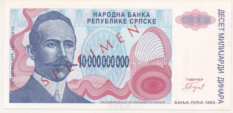 Description: Bosznia-Hercegovina / Szerb Köztársaság / Banja Luka 1993. 10.000.000.000D "SPECIMEN (Minta )", piros "A 00000000" és fekete "0096" sorszámmal T:UNC