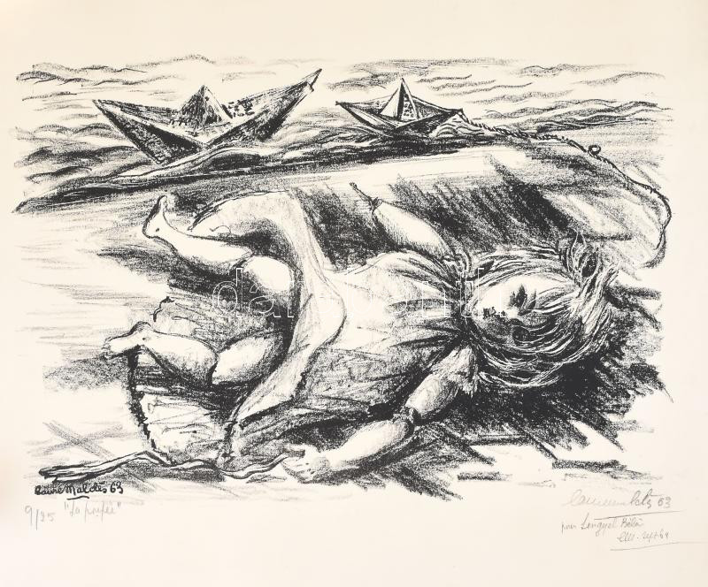 Laure Malcles Masereel (1911-1981): Játékbaba hajókkal, 1963. Litográfia, papír, jelzett, Laure Malcles Masereel autográf ajándékozási soraival Lengyel Béla irodalomtörténész részére (Lengyel Béla rendezte Budapesten a Masereel kiállítást), feltekerve, lapszéli apró szakadással, 31,5x46 cm