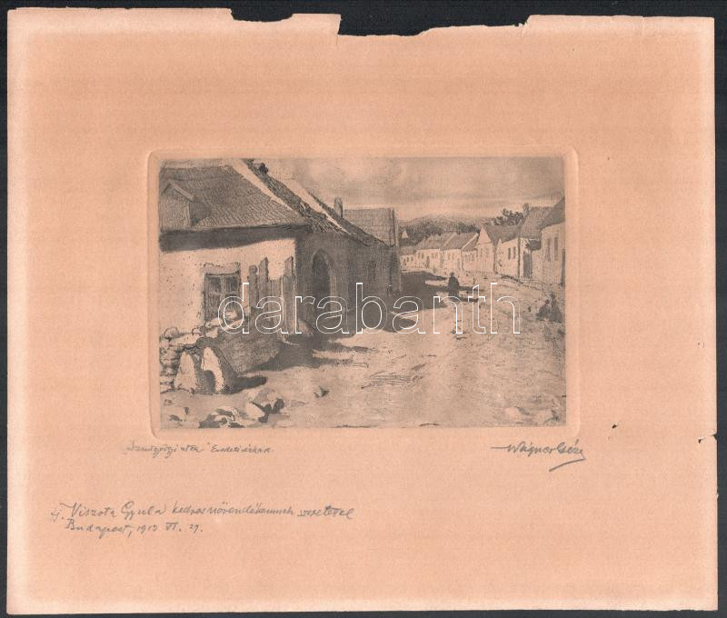 Description: Wágner Géza (1879-1939): Szentgyörgyi utca. Rézkarc, papír, jelzett, Wágner Géza autográf ajándékozási soraival 1913-ból, lap széle kissé sérült, 11×16 cm