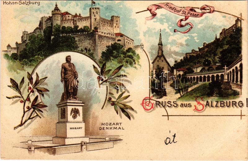 Salzburg, Mozart Denkmal, Hohen-Salzburg, Friedhof St. Peter / castle, statue, cemetery. Art Nouveau, floral, litho (cut)