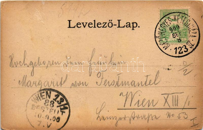 1900 Mezőhegyes, M. kir. állami ménes, lovak. Art Nouveau, floral + "MEZŐHEGYES - KÉTEGYHÁZA 123. SZ." vasúti mozgóposta bélyegző (EB)