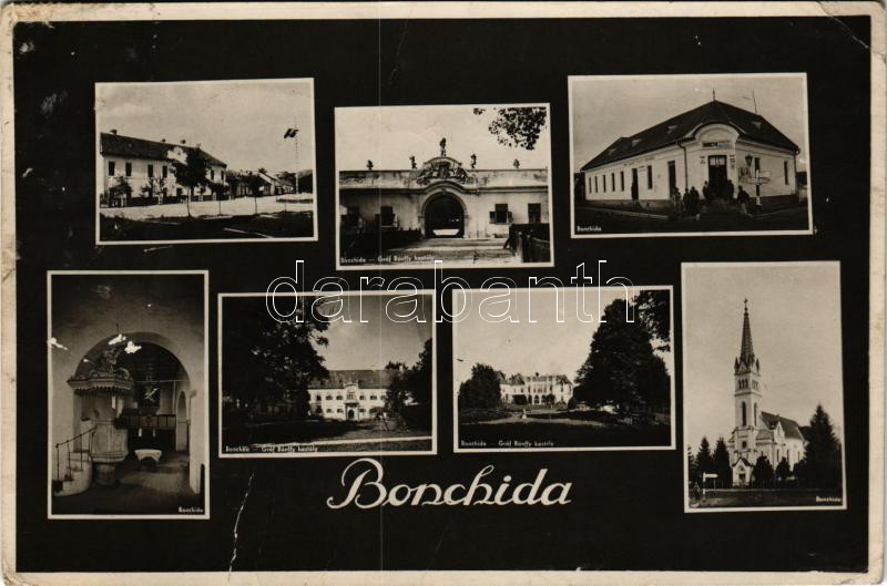 Description: 1943 Bonchida, Bontida; Országzászló, Gróf Bánffy kastély, Hangya szövetkezet üzlete, Római katolikus templom / Hungarian flag, castle, cooperative shop, church (fa)