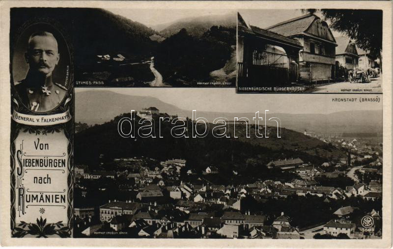 Brassó, Kronstadt, Brasov; Gyimes-Pass, Siebenbürgische Bürgerhäuser, Kronstadt. Von Siebenbürgen nach Rumänien, General v. Falkenhayn / Gyimes-hágó, erdélyi házak, Brassó látképe. Első világháborús német katonai propaganda / Ghimes Pass, Transylvanian houses, general view of Brasov. WWI German military propaganda with General v. Falkenhayn. Hofphot. Erdélyi