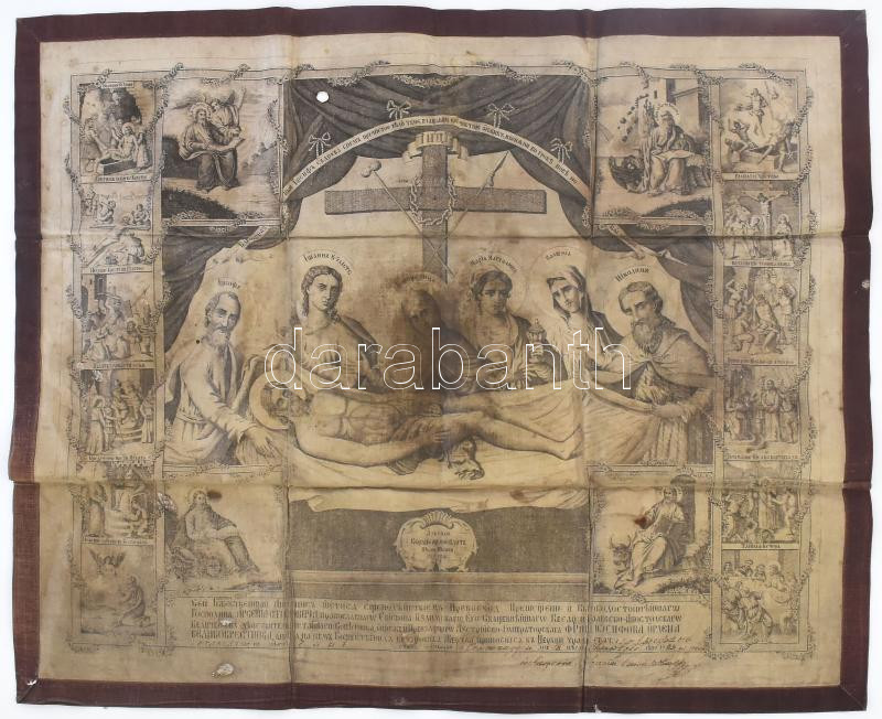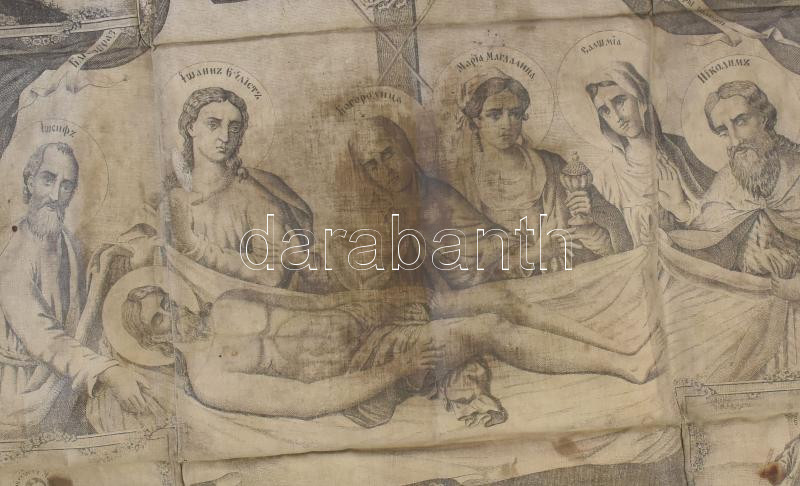 Antimenzion - Krisztus siratásának jelenetével. 1883, vászonra nyomott színezett fametszet, hátoldalon a kereszt vonalán felvarrott kegytárgy ereklyével, folttal, égési nyommal, 53x65 cm