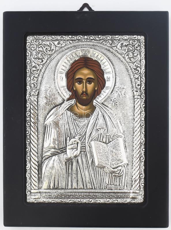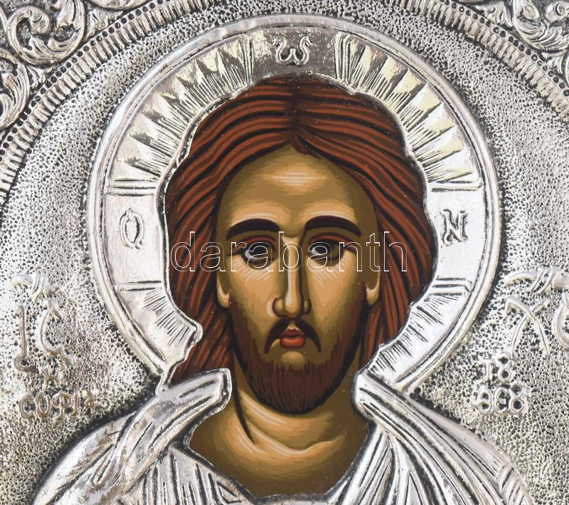 Pantokrátor Jézus. Modern ikon, ezüst (Ag) jelzett okláddal, 19x15 cm