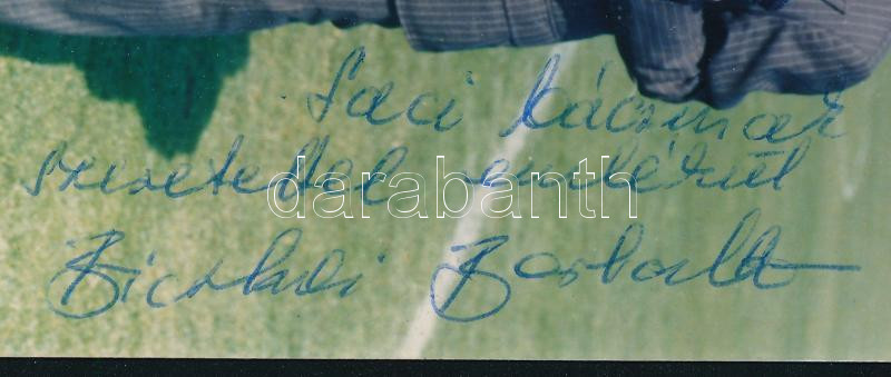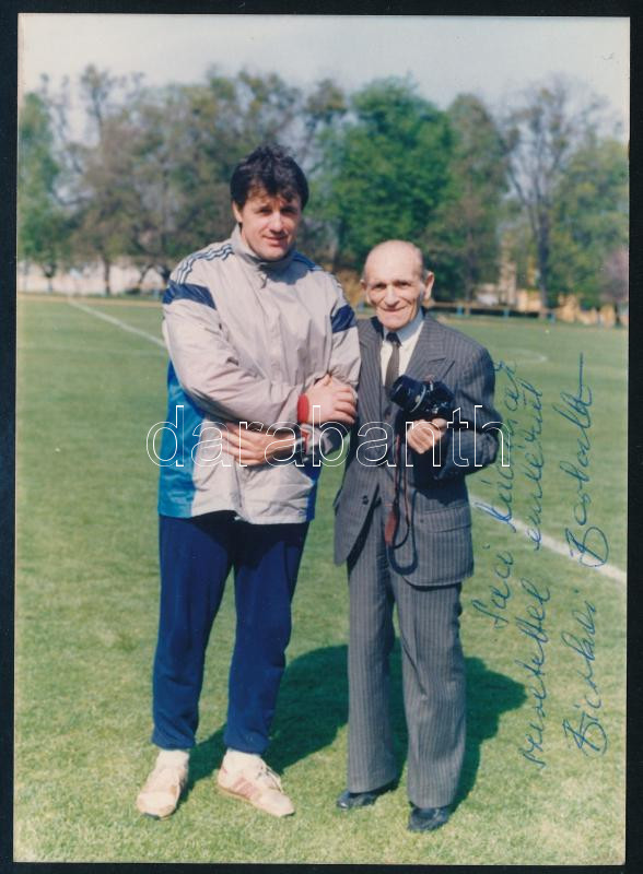 Bicskei Bertalan (1944-2011) válogatott labdarúgó, a magyar válogatott egykori edzőjének dedikációja egy őt ábrázoló fotón, labdarúgóedző, 14x10 cm