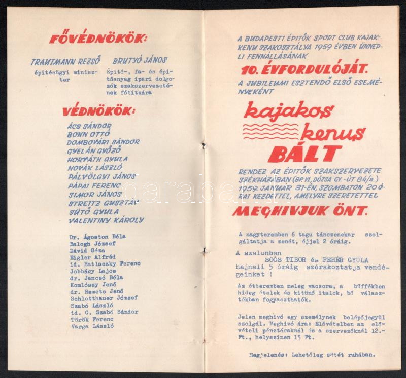 1959 Budapesti Építők SC jubileumi kajakos-kenus bál meghívója (tiszte...