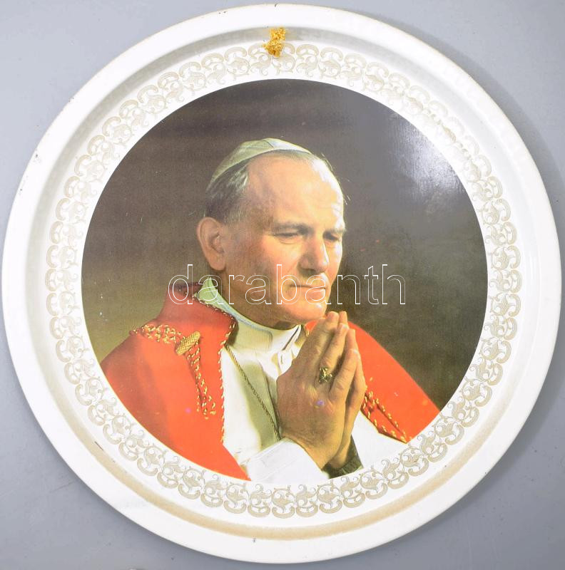 cca 1980 II, János Pál pápát ábrázoló fém tálca, fali dísz 27 cm