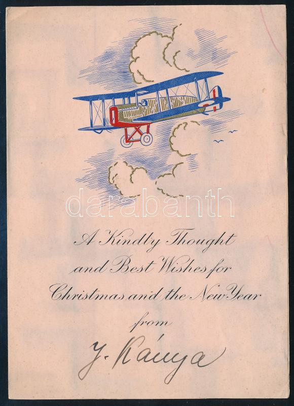 cca 1920-30 Újévi üdvözlőlap, nyomtatott angol ny. felirattal és J. Kánya aláírással, repülőgép illusztrációval