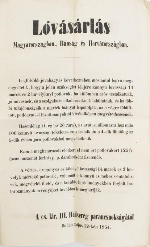 1854 Lóvásárlás Magyarországban Bánság- és Horvátországban. hadsereg hirdetménye 46x37 cm