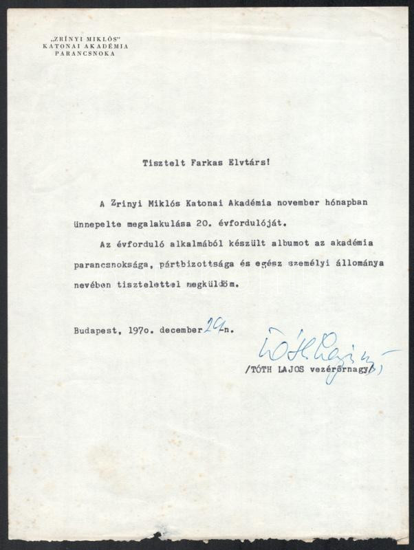 Description: 1970 Zrínyi Miklós Katonai Akadémia 1950-1970. Névre szóló emlékalbum (Farkas Gábor ezredes részére), Tóth Lajos (1922-2012) vezérőrnagy, a Zrínyi Miklós Katonai Akadémia parancsnoka (1969-1975), varsói katonai és légügyi attasé autográf aláírásával. Kiadói nyl-kötés, kissé koszos borítóval. Készült 100 példányban. + Tóth Lajos vezérőrnagy, akadémiaparancsnok aláírt levele