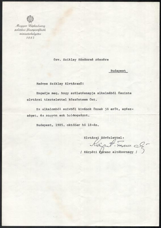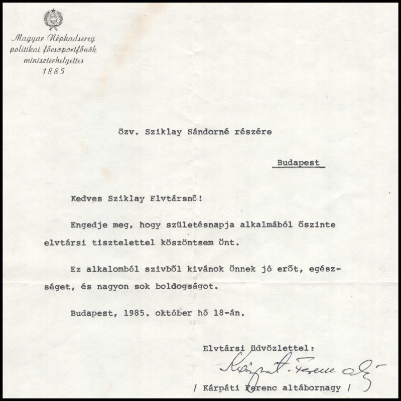1985 Kárpáti Ferenc (1926-2013) altábornagy, honvédelmi miniszter (1985-1990) autográf aláírása születésnapi köszöntő levélen, "Magyar Néphadsereg politikai főcsoportfőnök miniszterhelyettes" fejléces papíron