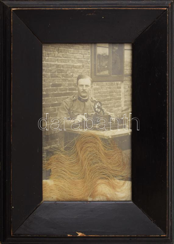 cca 1925 Katonafotó, az ábrázolt hajával, üvegezett keretben, 19x14 cm