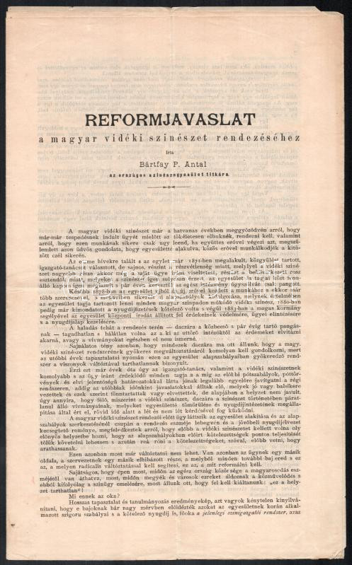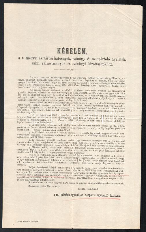 Description: 1889 Kérelem megyei és városi hatóságok, színügy és színpártoló egyletek, színi választmányok és színűgyi bizottságokhoz. + reformjavaslat a magyar vidéki színészet rendezéséhez 10 p.