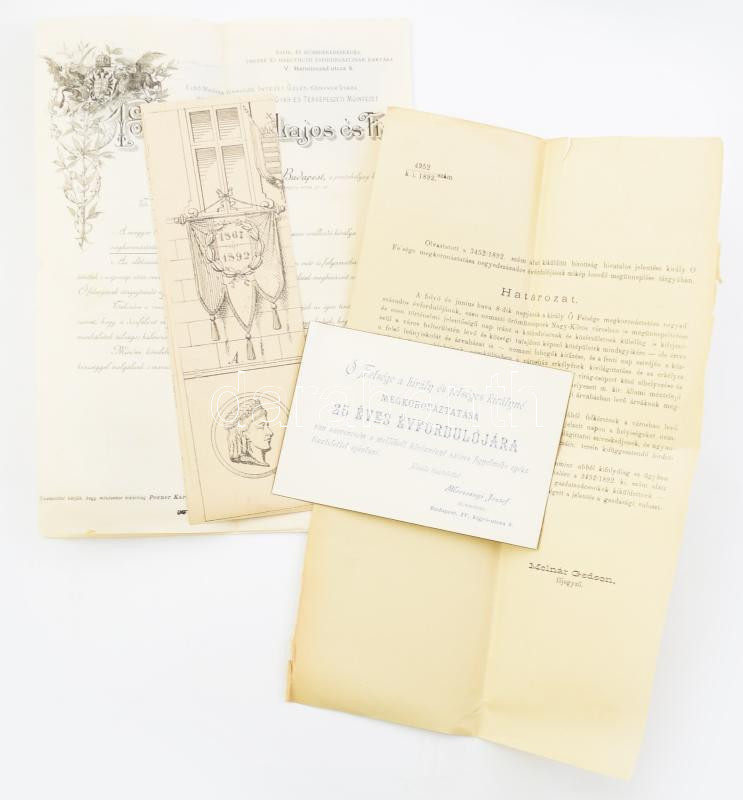 Description: 1892 Ferenc József és Erzsébet királyné megkoronázásának 25. évfordulója megünneplésére kiadott nagykörösi rendelet, Morzsányi ékszerész reklám kártyája, valamint díszokleveleket bemutató reklámja Rumbold zászlókészítő és Posner nyomdász alkalomhoz illő reklám nyomtatványa össz 5 db