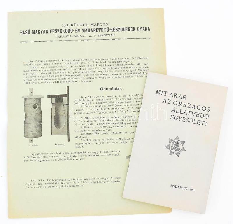 Description: 1911 Mit akar az Országos Állatvédő Egyesület. 36 oldalas kiadvány képekkel, + ifj Kühnel Márton első magyar fészekodú- és madáretető-készülékek gyára reklám nyomtatvány 4 p.