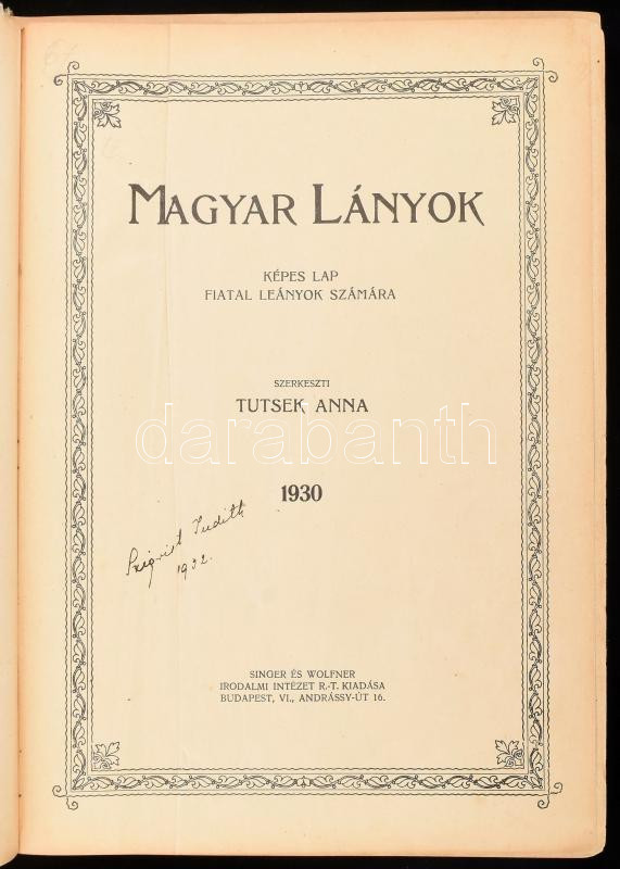 1930 Magyar lányok. Képes lap fiatal leányok számára. Szerk.: Tutsek A... https://www.darabanth.com/en/481-Online-auction/481.0/Art-and-other-collectibles/Printed-Materials~2000013/1930-Magyar-lanyok-Kepes-lap-fiatal-leanyok-szamara-Szerk-Tutsek-Anna-Bp-1930-Singer-es~II3287595