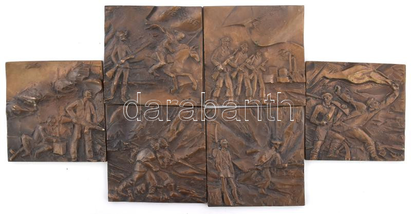 Description: Várhelyi György (1942- ): Magyar felkelések története. 6 darabos bronz plakett sorozat, mely szocialista realista stílusban ábrázolja a magyar történelem felkeléseit, jelzett, 10x10 cm
