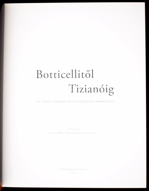 BotticellitÅ‘l Tizianóig. Az itáliai festészet két évszázadának remekművei. Szerk.: Sallay Dóra, Tátrai Vilmos, Vécsey Axel. Bp.,2009,Szépművészeti Múzeum. Gazdag képanyaggal illusztrált. Kiadói kartonált papÃrkötés.