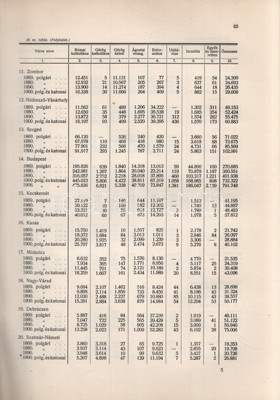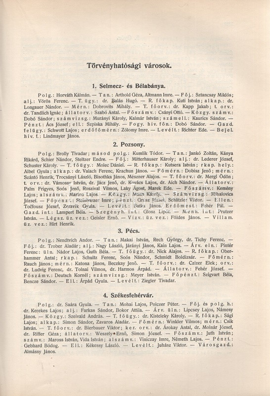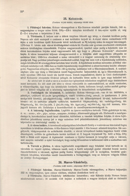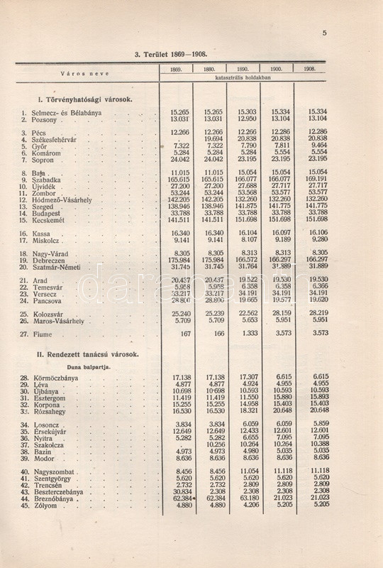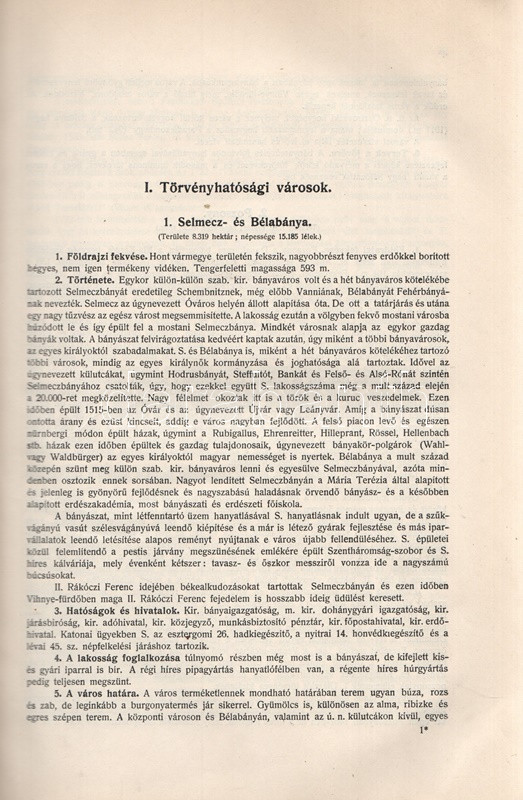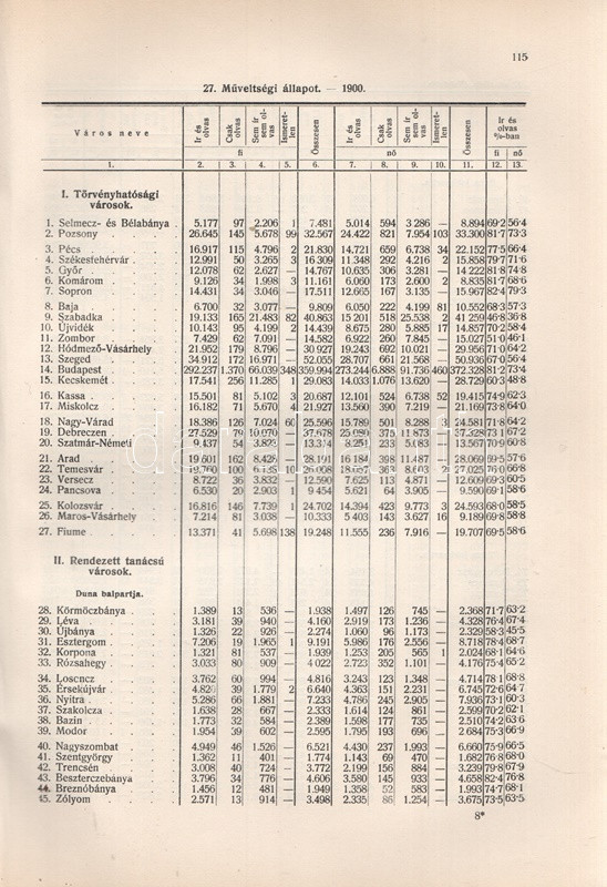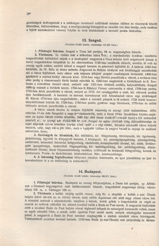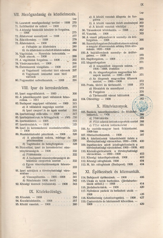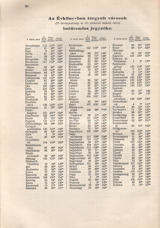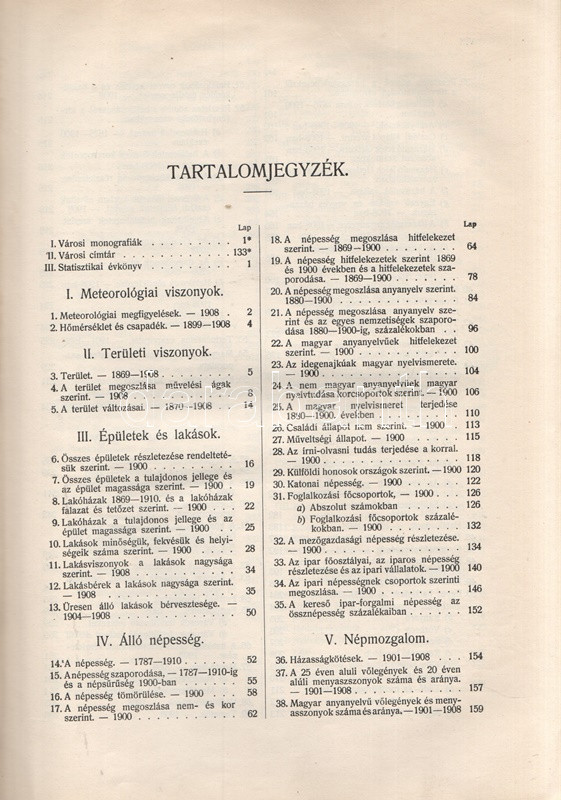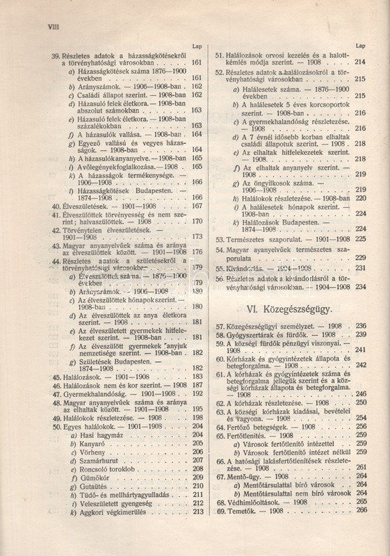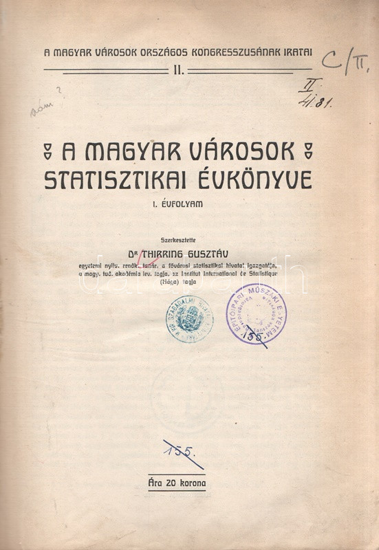 A magyar városok statisztikai évkönyve. Szerkesztette: Thirring Gusztáv. I. évfolyam. (Budapest, 1912. Budapest Székesfőváros Házinyomdája). XII + 158 + [2] + 686 p. A magyar városok statisztikai évkönyve monumentális pillanatfelvétel a hazai városok társadalmáról, gazdaságáról az utolsó békeévek egyikében. A szerkesztő, Thirring Gusztáv (1861-1941) statisztikus, demográfus, a hazai kivándorlás szakértője által szerkesztett tanulmánykötet első része rövid történelmi, földrajzi és gazdasági városismertetést nyújt az ország 27 törvényhatósági jogú és 131 rendezett tanácsú városáról, majd újrakezdődő lapszámozás szerint a legváltozatosabb témájú statisztikai adatok következnek az ország városairól. A statisztikai részben az egyes városok rendjében következő népmozgalmi adatok, anyanyelv és felekezet szerint, házasodási és halálozási statisztikák, a vezető halálnemek az egyes városokban, a szőlőterület adatolása, a helyi iparvállalatok lajstroma, a vasút és közúthálózat mutatószámai, a városban található automobilok, motorkerékpárok és kerékpárok száma, a vendégéjszakák száma három év szerinti bontásban, az utcatisztogatásban részt vevők száma, a nyilvános parkok és befásított utcák mennyisége, a rendőrségek létszáma a bűncselekmények jellegével párhuzamosan, a tűzoltóságok mutatószámai, a tanügy és szegényügy sarokszámai, a jelentékenyebb jótékony egyletek lajstroma, a helyi sajtó jelenlétének adatai, a város virilistáinak (vezető adófizetőinek) foglalkozása, a város önkormányzati tisztségviselőinek fizetése. Társadalomtörténetileg igen emlékezetes dokumentum. (A Magyar Városok Országos Kongresszusának iratai. II. szám.) Aranyozott gerincű korabeli félvászon kötésben, márványmintás festésű lapszélekkel. Jó példány.