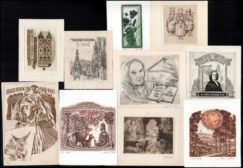 Klf. alkotól (Bálint Ferenc stb.): 10 db ex libris és kisgrafika. Klf. technikák, papír, egy kivételével mind jelzett. Klf. méretek.