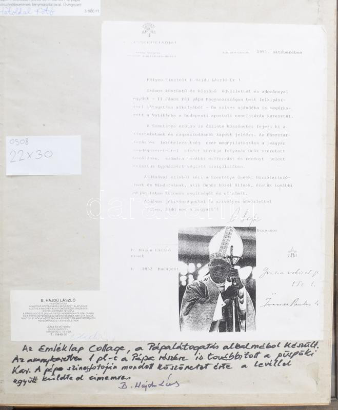 Description: B. Hajdú László (1926-1998): Emléklap II. János Pál pápa magyarországi látogatása alkalmából. Nyomat, papír. Hátoldalán jelzett és II. János Pál pápa köszönölevelének fénymásolatával. Üvegezett fakeretben. 39,5x29 cm