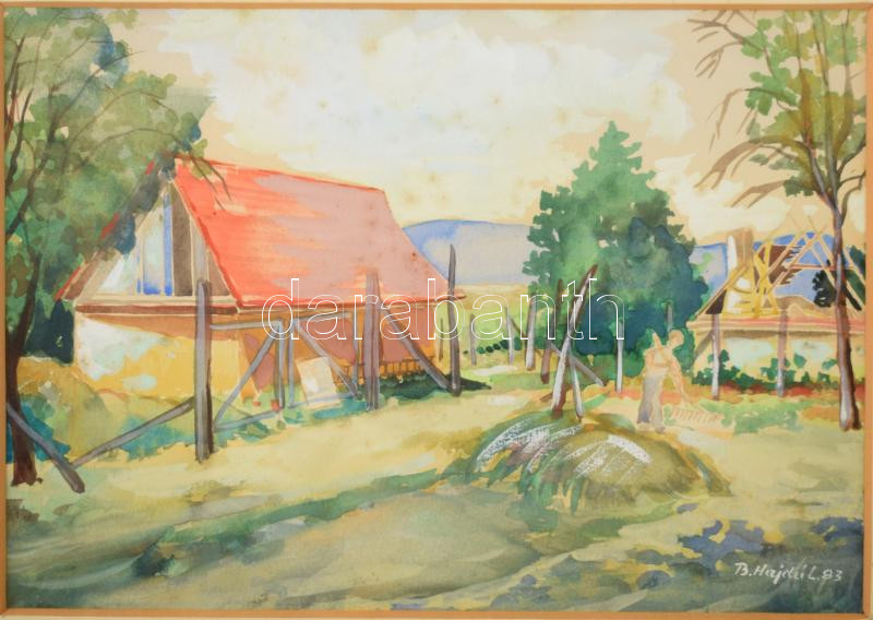 B. Hajdú László (1926-1998): Falusi táj. Akvarell, papír, jelezve jobbra lent. Kissé foltos. Üvegezett fakeretben, 24,5×35 cm