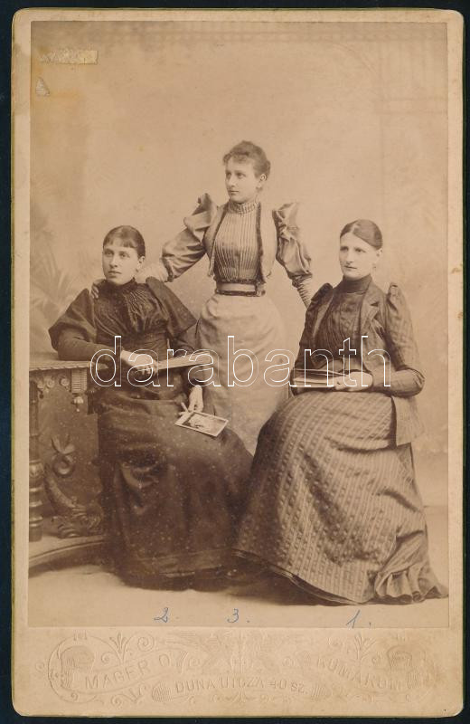 1893, Három fiatal nő, kezükben fényképpel, könyvvel. Keményhátú fotó, Mager Otto komáromi műterméből, kopással, 17x11 cm
