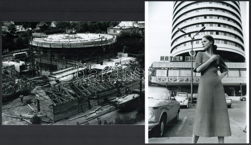 Description: A Budapest körszálló építése (cca 1965) és az elkészült épület előtt készült divatfotó (cca 1970), 2 db modern nagyítás, jelzés nélkül, a néhai Fővárosi Fotó Vállalat (FŐFOTÓ) reklámfotó stúdiójának archívumából, 21x15 cm és 15x21 cm