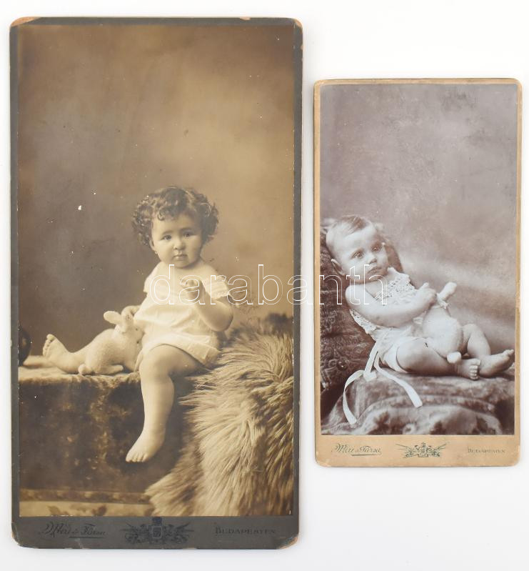 cca 1900, 2 darab plüssnyulat fogó babát ábrázoló kabinetfotó, Mai és Társa műterméből, hátoldalon a műterem képével, sarokkopással, 15x8 cm, 21x11 cm
