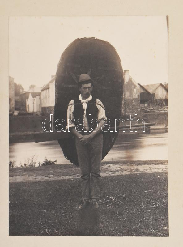 cca 1915 Férfi csónakkal a hátán, kartonra kasírozott, hátoldalon feli...