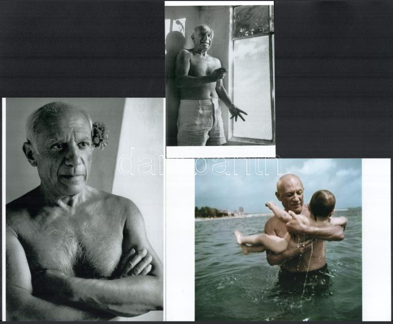 Description: cca 1948 Pablo Picasso (1881-1973) spanyol festőművészről készült felvételek, amelyeket Robert Capa készített, 3 db modern nagyítás, jelzés nélkül, a néhai Népművelési Intézet képzőművészeti referensének gyűjteményéből, 21x15 cm és 15x10 cm