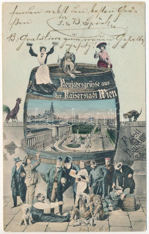 Description: 1904 Wien, Vienna, Bécs; Neujahrsgrüsse aus der Kaiserstadt Wien / New Year greeting Art Nouveau montage with barrel, drunk men, waitresses with beer mugs and monkeys (r)