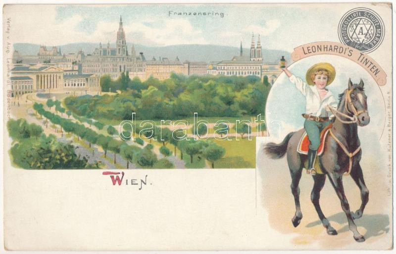 Wien, Vienna, Bécs; Franzensring. Leonhardi's Tinten Protokollirte-Schutz-Marke / church, square, tram. Leonhardi's Tinten ink advertisement card. Verlag v. Aug. Leonhardi Lith. u. Druck v. Kutzner & Berger Art Nouveau, litho (EK)
