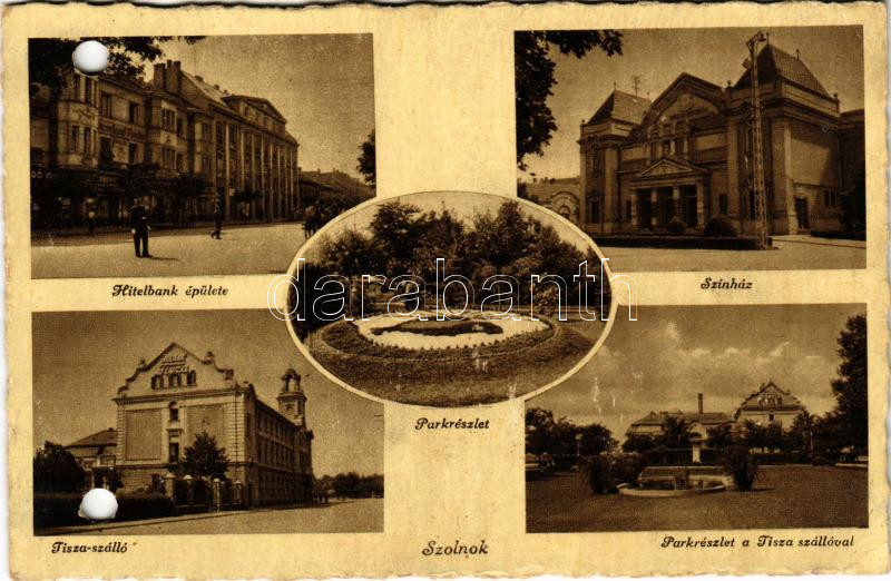 1944 Szolnok, Tisza szálloda, Hitelbank épülete, park részlet, irredenta virágágy, színház (lyukasztott / punched holes)