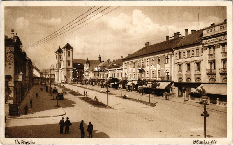 Gyöngyös, Hanisz tér, Grand Hotel Hungária szálloda, Café Korzó kávéház, Gyöngyösi Bank R.T., üzletek, automobilok (EK)