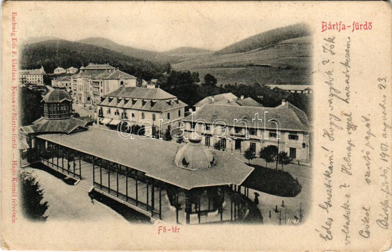 1901 Bártfa-fürdő, Bardejovské Kúpele, Bardiov, Bardejov; Fő tér. Esch...