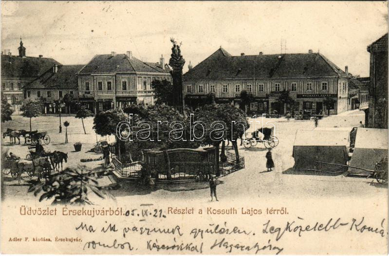 1905 Érsekújvár, Nové Zámky; Kossuth Lajos tér, Szentháromság szobor, Malinszky Rezső üzlete. Adler F. kiadása / square, monument, shops