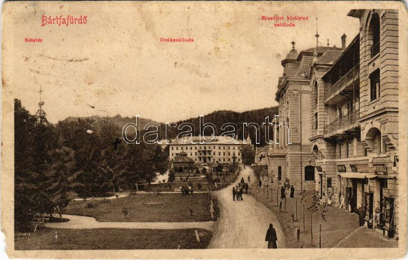 1916 Bártfafürdő, Bardejovské Kúpele, Bardiov, Bardejov; Sétatér, Deák szálloda, Erzsébet királyné szálloda, Werther J., Reichard Emil üzlete. Eschwig és Hajts kiadása, Hajts Kornél felvétele / promenade, hotels, shops (EM)