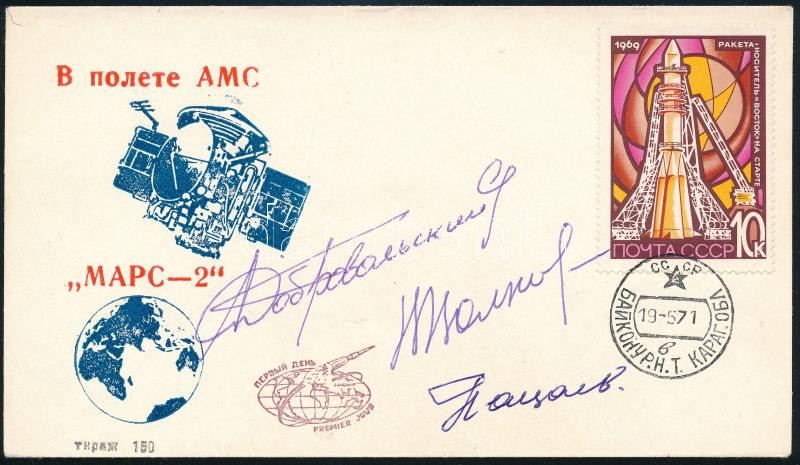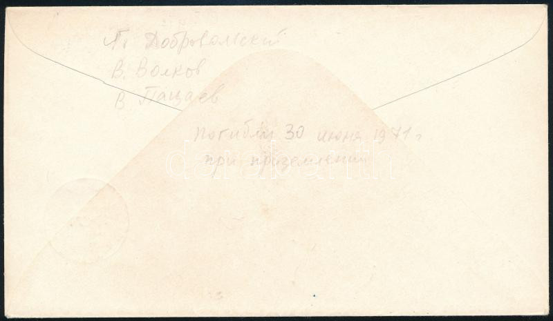 Description: A tragikus sorsú Szojuz 11 személyzete: Georgij Dobrovolszkij (1928-1971), Viktor Pacajev (1933-1971) és Vlagyiszlav Volkov (1935-1971) szovjet űrhajósok aláÃrásai emlékborÃtékon. Az indulás elÅ‘tt Ãrták alá a borÃtékot 1971 május 19.-én /