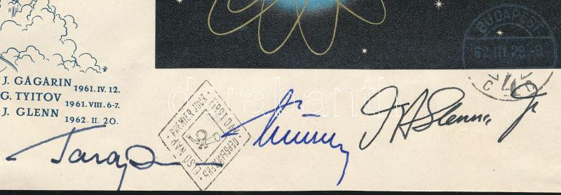 szovjet és John Glenn (1921-2016) amerikai űrhajós autográf aláírásai alkalmi borítékon / Autograph signature of Yuriy Alekseyevich Gagarin (1934-1968), German Titov (1935-2000) Soviet and John Glenn (1921-2016) American astronaut on special cover