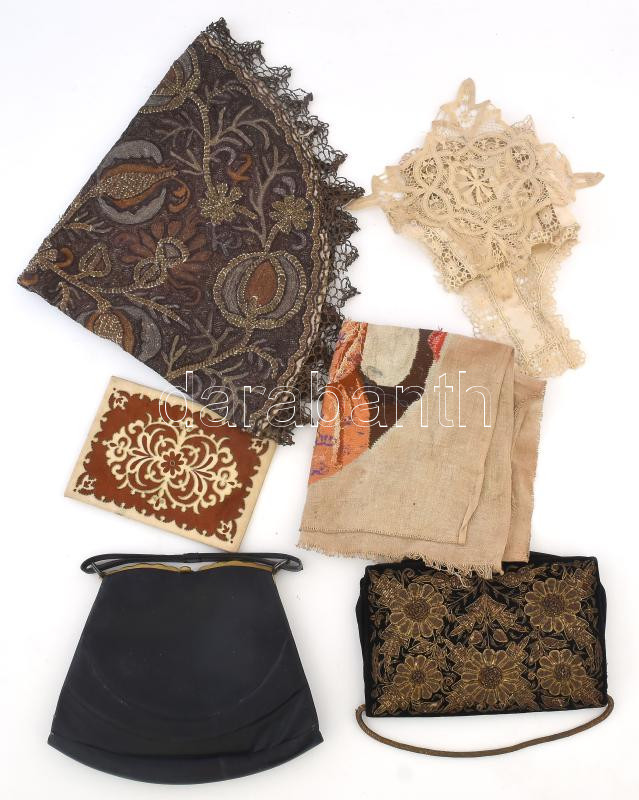 Régi táskák és terítők. Fémszál fűzéses d: 60 cm, régi színházi táskák, hímzések, csipkék