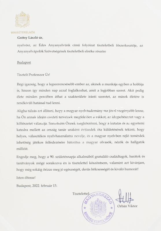 Description: 2022 Grétsy László (1932-2024) nyelvésznek szóló gratuláló levél és méltatás 90. születésnapja alkalmából Orbán Viktor miniszterelnök autográf aláírásával. Dísz mappában.