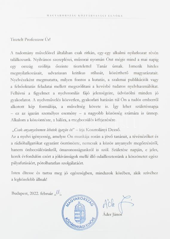 Description: 2022 Grétsy László (1932-2024) nyelvésznek szóló gratuláló levél és méltatás 90. születésnapja alkalmából Áder János köztársasági elnök autográf aláírásával. Mappában, borítékkal