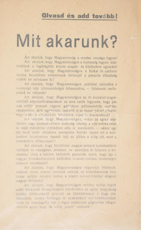 cca 1916-1918 "Mit akarunk? Olvasd és add tovább!", a Keresztény Szocialista Szabadszervezetek Országos Központja röplapja, antiszemita tartalommal, szakadozott, hajtott, 2 sztl. lev.