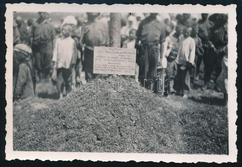 Description: 1942 "Itt járt a magyar hadsereg, keresztet, földet, szabadságot visszaadott nektek, 1942" feliratú tábla, valahol Oroszországban, oroszul, magyarul egy kereszt mellett két katonával díszőrségben, háttérben tömeg. Ritka fotó 6x9 cm