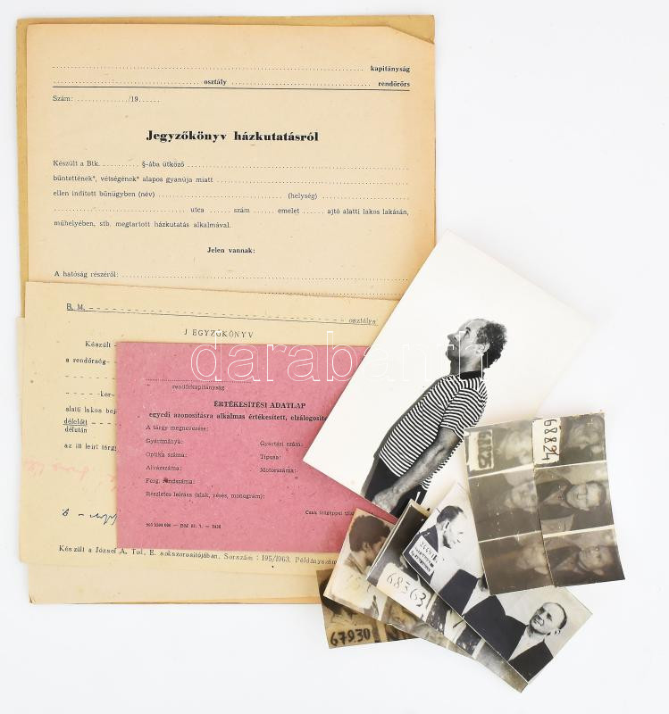 BM kitöltetlen formanyomtatványok: Személyi lap veszélyes bűnözőre, Értékesítési adatlap, jegyzőkönyvek, 5 db + Rendőrségi fotók, 8 db