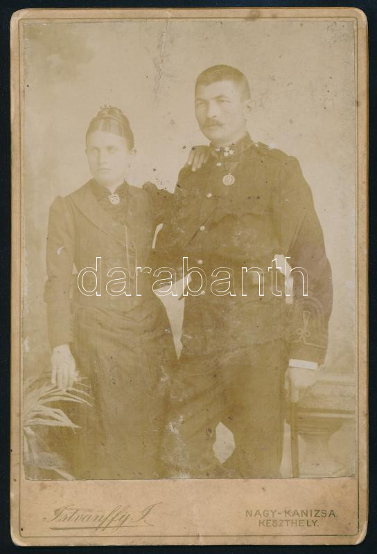 Description: cca 1910-15 Magyar főtörzsőrmester katonai kitüntetéssel, keményhátú vintage fotó Istvánffy nagykanizsai műterméből, kissé kopott, tetején töréssel, 16x11 cm